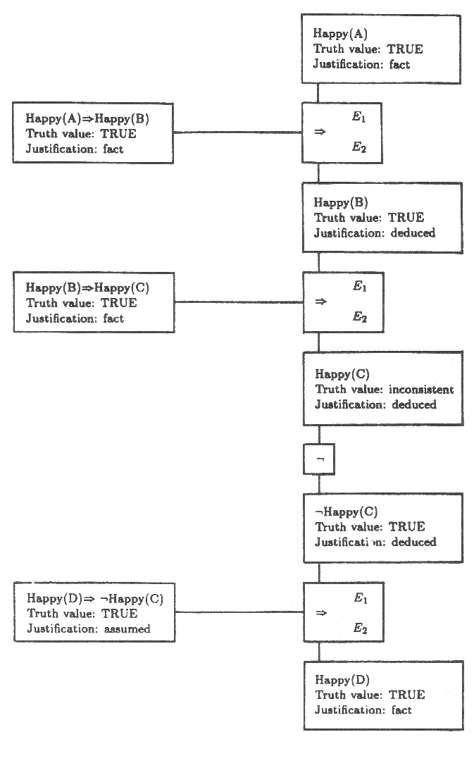 그림 11 : 진리값들은 Happy(D) 로부터 ⇒ 와 ㄱ 노드를 통해 진리 유지망을 거쳐 이동되어 Happy(C) 를 모순되게 한다.